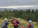 We voted to go to Eagle Ridge first, so we passed by the long lake with the beaver lodge before hiking up to the open bluff with great views to the west toward Vancouver Island. There was a bit of low fog in Discovery Passage, but the distant views were very clear. The sun was warm and relaxing so we ate and lounged a bit before descending to the lake and then continuing through the forest to Blindman’s Bluff with views to the south and east. We stopped again for this second viewpoint before completing the scenic loop and then returning to the vehicles. (7.3 km, 280 m, 4 hours)