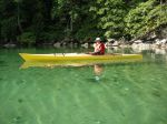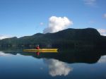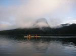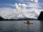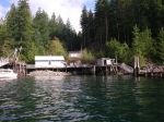 After waiting out the Sunday deluge, three of us spent the night at the Lodge to make the early morning slack at Surge Narrows. We paddled through with no trouble at 7:45 and spent the next six hours in a delightful trip to, and around the Octopus Islands. The weather was calm and sunny, and the area almost deserted. Just us, one sailboat, two kayak campers, the birds, the leaping salmon, and the seals. We explored a few campsite options for next season and visited “Wilson’s cabin” – a venerable wooden structure festooned with mementoes of visiting boaters, where we left an offering given to us by Beth, Lodge host (a gorilla sitting on a small boat labeled “Quadra” – created by whom, and why, who knows?). With the exception of one quick shower as we approached the narrows on our return, the weather was perfect and day a great success. We’re sorry that some of the usual paddling suspects were hors de combat with injuries or otherwise unavailable, and look forward to a return visit next year (with camping!!). (25.5 km; 7 hours)