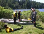 We had a sunny, breezy day for our paddling practice at Mine Lake. Jill, with help from Charlie, led a great session. After a short talk on the beach, the eight of us kayaked over to a more sheltered bay in the southwest corner of the lake. On the way over we practiced strokes and bracing. Everyone did at least one successful dump and re-entry, but each person chose what they wanted to do and how much. The water temperature was fine. We paddled through the narrows to Village Bay, practicing rafting up and getting an unconscious person back into a kayak along the way. Then we paddled back to the boat launch with the rising northwest wind at our back. We had drinks and snack on Les’ tailgate before packing up and leaving. Thanks very much to Jill and Charlie for their tremendous help on this.