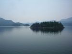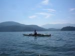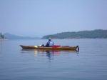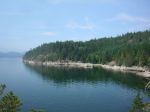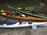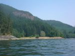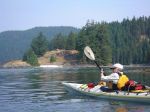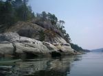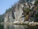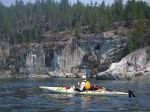 A group of six paddlers enjoyed perfect conditions for a tour around Kanish Bay on July 8th. The smokey atmosphere had cleared and we could enjoy the view across the Inside Passage. We made our way out through Chain Islands, then cut across the calm waters of the bay to Granite Point – a destination you can only attempt in such ideal weather. We poked around the point to take a look into Okisollo Passage, then moseyed back along the north shore of Kanish Bay. We had heard that there were pictographs somewhere along the cliffs, and happily we were able to spot a couple of sketchy images in red pigment. Lunch was on a rocky point part way along the shore, followed by a swim at Orchard Bay. It felt like a pretty mellow day, but we covered 18 km in our circuit around Kanish Bay.