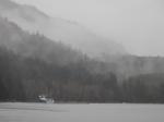After about 2.5 km we parked the cars and walked the last half of the road down to the shore. Beyond the logging, it’s a beautiful, steep valley with lots of water in the creeks. There are a number of buildings strewn around the shore site, in varying states of decay – remains of a fish hatchery that has been closed for over 20 years now. Previous to that, the site was a log dump. Sometimes the bay is busy with boats waiting for slack tide to go through Seymour Narrows, but there was not much action on the water other than a couple of seiners huddled against the shore. Once the herring start to run, sea lions are sometimes spotted here, and I have watched a huge school of dolphin cavorting off the point. But all was quiet today and it was a soggy, grey view across the water.