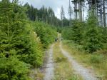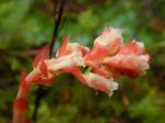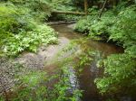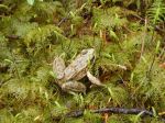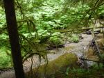 Despite the downpour the night before, 5 hikers accompanied by one friend of the canine persuasion braved the wet woods for a day of pleasant rambles. The original plans to explore down from Beaver Lake were altered to avoid much bushwhacking in the wet woods. The first ramble began from a logging road at the bottom of Gravel Pit Hill beside the full creek flowing south towards Open Bay. The area appears to be a second growth riparian zone, the rich forest included thick outcrops of Devil’s Club in bloom, all varieties of ferns and two frogs (Pacific Tree Frogs?) on the trail. The trail veered away from the creek up to one of the many logging roads in the area. We crossed the road and followed the flagged route up through a more recently logged second growth to a higher logging road which we followed back out to the junction where our cars were parked.