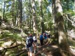 The nine of us had a perfect day for the hike to Nugedzi Lakes and lookouts. We started a bit earlier to get up the old logging road before the heat of the day. We stopped at a viewpoint just before the end of the old road with great views to the northeast and then continued on to the Lily Pond and the viewpoint looking southeast. We hiked through the ancient forest arriving at Nugedzi Lake in time for lunch and a swim. We continued on to the viewpoints over Discovery Passage and then retraced our steps, making the loop to Little Nugedzi on the return. We were quite warm and fairly tired when we reached the parking lot, but had a wonderful day. 11.9 km; 6½ hours.
