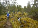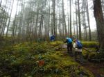 Seven of us started from the parking area where the WalCan Rd crosses Hyacinthe Creek at the end of Reed Lake. We followed Janis up Straight as a Dime in very light rain and low cloud, and continued until we joined Silk Stocking. At the end of Silk Stocking we walked down the logging road to Bite the Bullet. We crossed the bridge and took Lady Lumps to Cash Only, and then Rick’s Ride to Yellow Mud, stopping at the beaver dam. This is a very lovely loop. There are great mossy bluffs, historical open copper mines with some old mining artifacts, open forest, and wet lands, complete with ducks. 10.9 km; 4 hours.