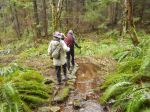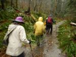The trip to Salmon Point was postponed due to rain, wind and fog on Wednesday morning. Having rained more than 50mm in the last two days, it was really wet out. However, five hardy souls decided to substitute a more sheltered walk and headed out. We walked to the eastern beach at Morte Lake. The trail was quite wet and has seen some erosion with the winter rains. All of the creeks and waterfalls were very active. The group was keen to continue so we walked around the east end of the Lake, hiking up Nirvana and Seven Deadly Sins to the open bluff. We had a watercolour view from there of nearby hills and Discovery Passage before heading down Dead Fish to make a loop returning to the vehicles. This is a lovely walk through open forest, including lakes, creeks and views. The rain diminished and there was a bit of blue sky by the time we finished. 7.3 km; 2½ hours.