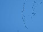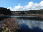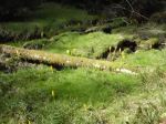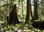 We had a perfect hiking day for this walk through varied forest to see some of Quadra’s biggest old growth trees. The first part of the hike skirts Vic’s Marsh through open forest and passes meadows with fruit tree, nettles, Vic’s barn-like house and old fencing. We stopped briefly at the bluff overlooking the open water part of the marsh to enjoy the view and watch huge numbers of geese heading north. The next section follows a narrow, flagged trail which undulates, often along a creek or below bluffs and heads into Main Lake Provincial Park. After the T-junction with the logging road, the right turn leads more or less north with a gradual grade and wide allowance, though very wet at this time of year. The trees are plastered with lichen and moss making it an enchanted forest. After crossing a small creek, the trail ascends to the glade with old growth Douglas fir and cedar. But there are big trees along the whole walk.