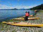 Day 3: Breakfast and ready for another paddle. A bit windy at the start of this day. A member was leaving and we all paddled to Whaletown Bay, assisting with unpacking and putting the kayak on vehicle. Four of us then paddled through Plunger Passage, into the beautiful scenery of Sutil Channel and found a landing spot to eat lunch. Paddled onto Carrington Bay which is one of our favourite places. Explored the bay and lagoon. Back into our kayaks and paddled through Coulter Bay. A good workout for us and stopped at Sea Vista for a break before heading onto the spit. We made it. ( 26.6 km; 7½ hours) Ate delicious clams at night.