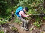 Eight members and one guest from Sweden took the 8 am ferry and drove 20 km north of Campbell River to the Broken Eyes trailhead. The trail is an easy grade for the first bit, then it crosses a stream on a long, one-log bridge, then it climbs steadily. There is a viewpoint (facing north) part way up which makes a nice rest stop before resuming the climb. Eventually the trail joins an old logging road with an easier grade. The final viewpoint (facing south) is good for a long, relaxing lunch, and the views are great. After the hot dusty trail, we adjourned to Roberts Lake where some had a quick, refreshing swim. 7.4 km; 5 hours; 510 m elevation gain.