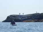 Six paddlers took advantage of another lovely day of warm weather and light breezes to kayak from Len Road Beach to Village Bay. We were on the water by 9 am, thankful for the high tide allowing a quick launch. With high tide and calm waters, we went through Shellaligan and on to Village Bay. Several hikers were sunbathing on the rocky outcroppings along the trail, but no other wildlife. This was especially disappointing as just a few days ago a huge pod of Pacific White-sided dolphins spent most of a day in a feeding frenzy in Open Bay. We reached Village Bay at 11:30, brunch time. The beach was surprisingly clean, though a few small items were picked up and one aquafarm basket was left, hoping boaters would take it back. A classic wooden boat was anchored in the bay and we admired their husky dog, and the amazing crop of lettuce flourishing on the back deck. An easy paddle back to Hyacinthe Bay, more hikers lounging on the Shellaligan rocks, though no-one braving the chilly water. A flock of seabirds were noisily feeding in the intertidal at the north end of Hyacinthe Bay, and several dozen seals were dozing, and arguing, on the Seal Rocks.