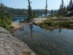 This was an unscheduled, impromptu trip. We took advantage of a break in the weather for a tour of the lakes on the Forbidden Plateau and at the last minute decided to push on to Cruickshank Canyon. The day was cloudless, with a reasonable summer temperature, and a bit of smoke haze on the horizon. We caught the 7:05 ferry and were hiking shortly after 8:30. We hiked the lake loop clockwise, arriving first at Battleship, then Lady, Croteau and Kwai Lakes. We explored the excellent new group campground at Croteau, complete with yurt cooking shelter, and had lunch at Kwai. We hiked the spur to Mariwood and Beautiful (well named) Lakes and continued to Cruikshank Canyon. The haze was most noticeable across the canyon, but the viewpoint drop-off is always impressive. We stopped at Mariwood Lake on the return and Julie swam in the cold water, before hiking up to the Ranger station and on to Helen Mackenzie Lake.