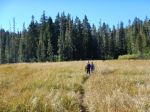 At this point it is necessary to cross the outlet stream from McKenzie Lake. It turned out that the Lake level was a few inches higher than expected and the puddle jumping rocks were under water. At this obstacle, five people and the dog decided to go up to Paradise Meadows, leaving three to continue to the Lakes as planned.