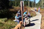 Reporting from Paradise Meadows and beyond – On a perfect fall day, we began with the intent of hiking to Douglas and MacKenzie Lakes, and enjoyed the drive and short hike in. Then, deciding to eschew the fun of wading across the high water in the creek in our bare feet, five of us, and one dog, decided to walk in Paradise Meadows instead. We had a lovely, brisk walk around the Battleship Loop with a brief lunch stop in the Meadows, alive with the vibrant fall colours. The views across the lakes were astounding. We enjoyed chatting with some of the overseas visitors we met on our perambulation. 10.5 km