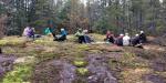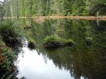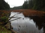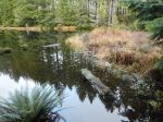 Fifteen hikers, along with Kona and Joey, the dogs, enjoyed a three hour hike in the area south of Walcan Road, starting at the pullout at Reed Lake. The weather was great for November – cloudy but with no rain, no wind and a pleasant 8° C. We headed south on Straight-as-a-Dime Trail, following a combination of newer bike trail sections and old logging roads. Turning east onto Backdoor Trail, we hiked over vibrant green moss-covered rock bluffs, through pine forest and past a perfectly mirrored pond. Shortly after going past some old mining camp debris, we headed north and followed Dick’s Ride down to Nighthawk Lake (variously named Yellow Mud, Hilda’s, Wood Duck and Beaver Pond Lake). Walking alongside the large lake created by a 20-meter-long plus beaver dam, we spotted Bufflehead and other waterbirds, and an unidentified hawk. We continued northwest down Yellow Mud Trail through lush sword fern, hemlock and Doug fir forest, paralleling McKercher Creek before arriving back at Reed Lake. 8.1 km.