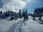 Four of us and a dog snowshoed at Ramparts Hill in deep powder. For the coast, the quality of the snow was exceptional and the sun was glorious. There were quite a lot of others out enjoying the day and we had our choice of broken or unbroken routes. We wandered along the open bluffs facing east with views of Sutil Channel and the mainland mountains. We tried out some steep descents, ascents and had lunch at the top of a knoll before heading back to the car. 6.1 km; 3 hours.