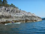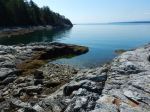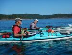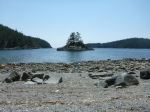 Six kayakers put in at Len Road and across a low tide exposed beach on a beautiful spring morning – sunny and warm. Because we found ourselves in very calm conditions as we crossed Hyacinthe Bay, and with the forecast not calling for significant wind until late afternoon, we made the decision to add Dunsterville Islet to our itinerary. It took about an hour to reach the islets and we decided to land on the smaller of the two to explore and have a short break. We found excellent campsites, a profusion of wildflowers of many kinds, a pair of oystercatchers and the inevitable plastic junk. An hour later (not such a short break) with two hatches full of trash and many flower photos taken, we headed back across a still calm Hoskyn Channel with our sights set on Village Bay and lunch. The views in all directions were fabulous and only slightly obscured by smoke from very distant forest fires. We thought about going a little further on to Crescent Channel but time and hunger kept us on track for the beach, on Wei Wai Kai land, at the head of Village Bay. As we ate lunch in the hot sun and sheltered by the small island just offshore, the afternoon wind was picking up and we could see the water sparkling off in the distance. One brave swimmer tried the water. We put in at 1300 and headed south into a rising tide and increasing southerly wind. The sparkly waves in the middle of Hoskyn soon sprouted whitecaps and we had a very different afternoon paddle. The changed conditions gave us some variety in our day and allowed one of the group to give her brand new kayak a good test. We took the seas broadside as we crossed Open Bay and then had the tide and the wind help us cruise into Hyacinthe and into the beach, now much closer to the parked vehicles. 17.2 km; 5½ hours.