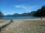 Seven members and two dogs hiked the path from the Surge Narrows Road to Main Lake. The route was dry and in good condition, with the usual deadfall trees to climb over, under, or go around. It was cool in the shade of the forest. The forest has several notable big Fir trees and an open understory. After lunch at the lake, four of us walked to Yeatman Bay, three of us stayed at the beach to swim and nap. The dogs split up. We saw a mink emerge from Yeatman Bay and run into the forest. At the Main Lake beach we were out of the wind, but we could see lots of whitecaps further out. 9.8 km; 4½ hours.