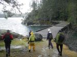 Changeable weather at its best. Leave home in winter wind and rain, and arrive at the trailhead in sunny spring. We did delay the hike by a few minutes, to allow the weather to get over it, by visiting the old Union Steamship dock at Bold Point. The steamships stopped running in 1953. The dock was built sometime after 1901. The dock itself is gone except for the concrete part. The bridge is still there.