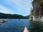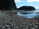 Day 1. Six paddlers launched from the end of Valdes Road on a fairly high tide, leaving the beach about 10:45 toward the Penn Islets. The weather was sunny with some overcast and the occasional rain squall, winds light. With a favourable current, we made excellent time, arriving at the campsite on North Penn Islet in just under 3 1/2 hours paddling time. A lovely classic cruiser was anchored in the nook south of the campsite, but very few other boats seen. The campsite is beautiful, with great views from the bluff, and some good forest sites also. Distance covered – 16.6 km in 3 hours and 20 minutes.