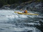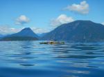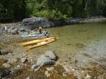 Day 2. As the day was sunny with light winds forecast, we made a side trip to the entrance of Von Donop Inlet and stopped for a break at the campsite in Robertson Cove. While the location has several tent sites, and a trail to Robertson Lake, it seemed dark and is exposed to the west. Easy landing. We then paddled toward South Rendezvous Island, our planned stop for the night. Unlike other years, this large and very attractive site was empty. The summer has been disastrous for local outfitters, but it has meant that more camping options are available than usual. Easy access from the north, several tent sites, and a small creek. One or two tent sites also available on the tidal island in front of the main site. Hot afternoon. Distance covered 16.2 km in 4 hours and 10 minutes.