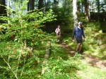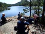 Six hikers enjoyed a perfect, late summer day for our hike up to Nugedzi Lake. We opted for the second, slightly higher viewpoint as our first rest stop, much appreciated after the usual slog up the eroded logging road. The views, though somewhat hazy, extended to the Coast Mountains and south to Texada Island. The Old Growth Forest was a welcome respite from the increasing heat. We were surprised to find how eroded the trail here was in some spots, tree roots fully exposed in many places, possibly the result of increased traffic (we actually saw 9 other people on the trail at various times) and the heavy rains of early summer and recent days. (We learned later that one of the 9 was a local trail runner, who was on his way back from having run the entire trail up from the Nugedzi trailhead parking lot, down to the Mt Seymour parking lot on Granite Bay Road and back over, after having biked to the trailhead from Heriot Bay. And we thought we were putting in an effort just to do the Nugedzi hike. )