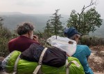 Day 1 – Tuesday: Leaving the ferry behind at 10:15, we left one vehicle at a friend’s house near Mowat Bay, near the end of our walk, and drove on to Lund with our other vehicle, catching the Lund water taxi at 2 pm, destination: Sarah Point. The taxi dropped us off in hazy conditions on a dry rock shelf, from which, after the “before” photos, we donned our lightweight backpacks and started the walk through arbutus and manzanita groves to Feather Cove, our first campsite. We shared this site, looking east towards Malaspina Inlet, with a young kayaking couple, and were visited frequently by a curious sea lion as we set up camp. At this point, one is in Malaspina Provincial Park, and the campsite is outfitted with an outhouse, food cache and picnic table. This was truly roughing it. This is where one of our group revealed their secret weapon, a backpacking chair, and quest for seating began!