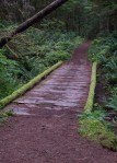 Day 5 – Saturday: This morning, the darkness of the forest and the night’s rain had us up a little later, but we were on the trail a little after 9. We had another 15 km to reach the end of our route. The descent down Appleton Creek was a mossy forest trail with several stops for small cascades and the larger Gorge Falls. Further along we entered lands given by the Sliammon people to allow the trail to continue to Sliammon Lake and Little Sliammon Lake, with its picnic pavilion, boat wharf and road access. The trail around the lakes is an up and down workout around bluffs and roots, but only for a portion of the days hike. From Little Sliammon we mostly followed old forest roads down to Sunset Park, and increasingly saw bear scat, and many friendly day hikers as we approached the suburb of Wildwood. At Sunset Park, we dropped our packs and congratulated ourselves. Two of us continued along streets to the bridge at Powell Lake outlet, and then again picked up the Sunshine Coast Trail to Mowat Bay, just down the road from where we had left our parked car. The timing was perfect, as we encountered our first daytime rain just before we reached Mowat Bay.