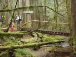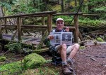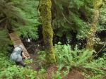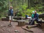 Day 4 – Friday: We were back on the trial this day around 9 am knowing that we would add the first real increase to our daily distance, covering 13 km. The first part of this day had us climbing up the Thunder Ridge Trail.. After the Plummer Creek Road we were treated to an old forested rail grade, which lead us to a rest spot at Plummer Creek Bridge. Below, a 5 minute walk leads to the Plummer Creek campsite, near the bottom of Toquenatch Creek. After our break, about an hour later, we arrived at Toquenatch Falls, where water still cascaded over rocks, although nowhere the force that would exist after a rainy fall. The trail continued up the creek valley, sometimes using old rail grade, and eventually comes to a newer logging area where we had another reminder that we were out of the park, as we could hear a logging truck close by, lumbering up a grade. Eventually, the trail took us to a road system, and the Homestead Forest Recreation site. This was accessible by vehicle, and after a quick lunch held no real interest for us. Here, we met, Nick, a young fellow from Victoria, who had passed us the previous evening at Fern Gully, but was now lying on the ground, in some obvious discomfort, nursing a nerve injury from long bouts of car driving. We could only offer ibuprofen and encouragement, but Nick seemed to be familiar with the condition and was weighing his options. The afternoon then brought us up a climb to Rievely Pond with its lovely hut in an open spot above the pond. Water was not the best here, but we enjoyed a rest and continued to our intended goal, the Appleton Creek Bridge Campsite, a lovely open site amongst several old growth giants, next to a very good running water source. Above the campsite is a trail leading up to a bathing pool in the creek. We had benches at camp for cooking and sitting, and an outhouse, although its location was hidden to us until the next morning.
