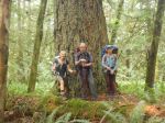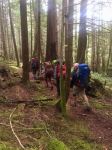 Day 3 – Thursday: Again we were back on our route by 9 am. We had to climb out of Wednesday Lake but the trail had some pleasant forested walking before our accent to the Gwendoline Hills. The walk along this ridge was fairly flat, but again we climbed as we neared McPherson Hill, after leaving Malaspina Park behind. After a walk through lovely old growth, we reached Manzanita Bluff, where a beautiful mountain hut awaited, and an expansive view of the Salish Sea would have been our reward, if it hadn’t been obscured by alternating smoke and fog. Unfortunately, we could barely see the darker mass of Hernando Island in the distance. Nevertheless, it was a beautiful lunch spot with picnic tales. We now descended through commercial forest lands, containing some lovely old trees, where the forest companies have allowed a right of way for the trail. Later, we came to Emil’s Bench, dedicated to Emil Kormpocker, a veteran logging contractor who had the foresight to save a stand of old growth trees in this area. Unfortunately, the younger forest around us obscured views of the saved old growth. Here you also have a view of Okeover Inlet below. Eventually, through some older forest, we crossed over Malaspina Road, and continued on to our next campsite, Fern Gully Creek. Here we had one of our darkest campsites, thanks to some old growth giants, There was adequate space for tents here and a rustic table. Although we had water, the pools may be drier at the end of a hotter summer. And we could find no outhouse.
