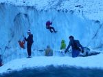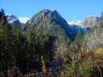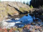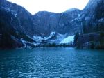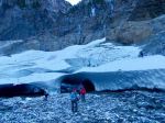 The destination is quite nice. Century Sam Lake is a glacial blue – it would be great with sunshine on it. We were too late in the season for that. The Lake lies in a hanging valley below Comox Glacier. A kilometre or so beyond the lake there is an ice patch with ice caves. Fantastic. For us, there was a strong, cold winter wind blowing across the lake, so we did not stay long.