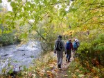 Five of us set out on the Quinsam River Nature Trail on a cloudy day made colourful by the colour of the Big Leaf Maples. The trail was quite busy with people walking and fishing. As we followed the path along the river up to the road near the Quinsam River fish hatchery, we could see a few salmon making their way up stream to spawn. We crossed over the road to follow the Tom Sawyer mountain bike trail. This trail rises quickly to a bluff overlooking the river, passes by some interesting mountain bike jumps and through a lovely mature forest. On a fall weekday, we had this trail all to ourselves. With the leaves still on the trees we only had peek-a-boo views of the river dramatically below us. We hiked this as an out-and-back, stopping well short of the end of the Tom Sawyer trail at the logging road with the metal post , where we paused for lunch and then hikied back. As we returned along the Quinsam River Nature Trail we had the treat of watching a very healthy black bear catch two large salmon and quickly eat them. He was unfazed by the audience. 11.8 km; 4 hours.