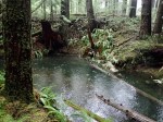Having had nearly 50mm of rain and plenty of wind the day before, we substituted a simpler outing nearer to home than the one that had been planned.  Eight of us headed out in light drizzle to see streams and waterfalls in the Quatsino limestone formation on Quadra.  We hoped that the bounty of water would result in saturation and good flow.  Starting off on an old logging road, we followed the drainage of a mostly underground stream which appears and disappears usually at the bottom of a series of large, deep sinkholes.  We could walk down into the sinkholes for a closer look at the water, the limestone and the ferns.  There was no trail and care was required not to step into small sinkholes covered with moss. so we made our way slowly through the deadfall and brush.  The final insurgence ended at a large pool forming from the constricted drainage.  From there, we walked a short way down a logging road and up a trail leading to a waterfall.  The falls emerges from a wetland and falls into a very large sinkhole.  The drop into the sinkhole was over 16m, for an impressive chute.  Even on the way home we passed creeks in full spate.