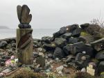 The best laid plans of mice and (wo)men and all that….it was supposed to be a “Hot Chocolate” walk but, while it was a good, brisk walk, unfortunately there was no hot chocolate, or coffee, hot or cold, for that matter. Meeting up after the 10am ferry, five enthusiastic walkers strode briskly south in a light drizzle along the Campbell River waterfront to our destination, FoggDukkers. We enjoyed the opportunity to view the unique and moving Memorial Garden, the Yoda-like wood sculpture, and give our (inexpert) opinions on various dwellings along the route. However, our intended hot chocolate stop was, sadly, closed. We opted to not stay to have an early lunch at the intriguing ‘Big Garage‘ restaurant opposite, but did note this as a possible destination for a personal trip another time . And maybe the bad luck was in our favour as the weather closed in and turned to a thick drizzle as we headed back, a longer trip would have been very wet! The fast walkers were on the 12:30 ferry heading home to dry out and enjoy hot chocolate, or soup, in comfort. (Note to self ….make sure to confirm with FD in person before committing to this walk in winter again ) (2 hours. 8.7 km)