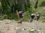 The views of the Strathcona Park mountains were great. There are also views back over Georgia Strait/Salish Sea; we could make out Quadra in the haze. We reached the summit by 11:00 and stopped for lunch. Brent set up his radio and antenna and made a contact. It’s a very enjoyable hike over this long, undulating ridge. The hardest part was walking down the steep logging road with loose gravel. Altogether it was 11.7 km, 5½ hours, 450 m elevation gain (from bottom to top), but more overall with the undulations.