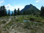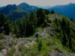 Wandering along the sub-alpine ridge is very pleasant. It continues up for a bit more than a kilometre until the ridge is quite level and more distant views are revealed. There was significant heat haze, making it tricky to see Quadra from the ridge and there was forest fire smoke to the west from lightening strikes the night before in the Nimpkish Valley.