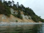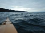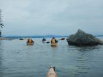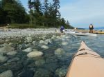 By 8:50 we were on the water just as the ferry was docking – one less thing to worry about. Weather, tides and currents were all in our favour as we rounded Whiskey Point and headed south to Cape Mudge. We passed by the Village and the campground and then rounded the Cape. The often turbulent waters were very calm, due to our timing, and we headed into the boulder strewn shallows of the south shoreline. By this time we were looking for a reasonable place to pull out for a “rest” and stretch. A cobbly beach was the best we could do.