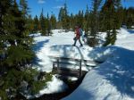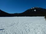 Except for one thing. The trail to Lake Helen Mackenzie crosses a stream on a bridge. The bridge was packed with snow, up to about a metre above the hand rail. It was well packed, but too narrow for snowshoes. And there was no way to avoid it since the stream was open. We crossed it, but once was enough, so we came back the Battleship Lake route. It also has a stream crossing with a snow-packed bridge. That one felt much safer, but it looked as if it might collapse sooner or later.