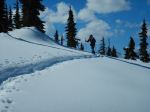 So we arrived at Lake Helen Mackenzie and stopped for lunch. We looked around for a further destination. Mt. Elma looked perfect, so we headed there. The trail was broken already, so it was an easy, though steep, climb up to the ridge. The summit ridge was amazing, open meadows with fabulous views. In particular the mountains io the Forbidden Plateau skyline, all snow covered in bright sun with no clouds blocking the view for once. (13.1 km, 6 hours)