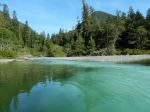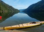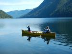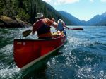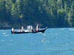 Six of us in two kayaks and two canoes set out on a beautiful summer day to explore this area hoping to find the campsite and the Grease Trail. We launched at 11:30 in calm water from the Woss Community Cabin, which is about 8 kilometres down Woss Rd. The views on this in-land fjord are wonderful with Rugged Mountain and the glacier at the southwest end of the Lake. By 13:00 the diurnal wind from the south began to build and continued to increase to about 20 knots until after sunset, but the wind didn’t die completely until midnight. We spent several hours pulled out on the shore waiting for the wind to abate. Magically, a large Namgis cedar dugout canoe came quickly down-wind while we were on shore.