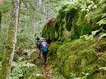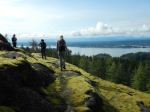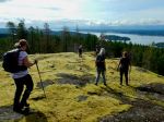 Six of us hiked this loop starting from North Gowlland Road. The recent welcome rain made the bushes wet and the day humid. We hiked North Gowlland Trail up to Rousseau Ridge with a short break for elevenses and to enjoy the view.. From there we descended the mossy bluffs toward Gowlland Harbour Rd, with a few short steep sections into the forest and back up on the ridge. Each ridge has great views of Discovery Passage and the Vancouver Island mountains, which were in cloud for us. We stopped for a leisurely lunch on the third and lowest bluff. We continued our descent to a logging road heading east and then picked up a route over lower, but still open bluffs taking us back to North Gowlland Trail. We enjoyed the three very old Douglas firs, the Three Sisters, on the way back to make our loop. Since we did this loop about 15 months ago, the flags have been removed, making the route finding trickier. 6.8 km; 3¼ hours.