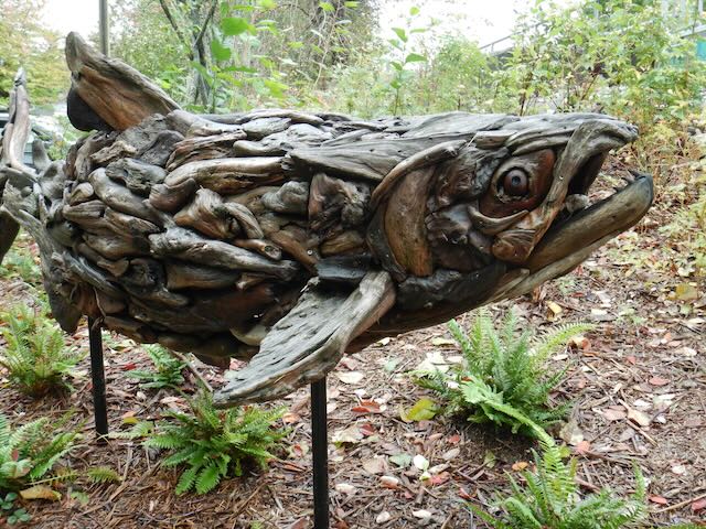 DSCN9158 Published October 17, 2023 at 640 × 480 in Trip Report – Haig-Brown House and Baikie Estuary – 16 Oct 2023 Driftwood sculpture salmon