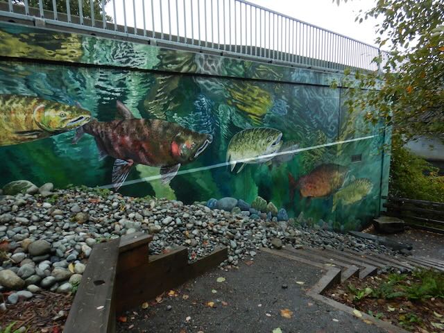DSCN9159 Published October 17, 2023 at 640 × 480 in Trip Report – Haig-Brown House and Baikie Estuary – 16 Oct 2023 Salmon mural