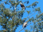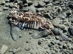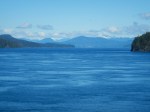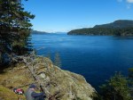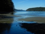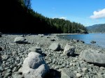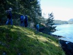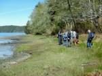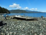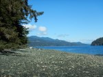 It was a perfect spring day. Seven of us drove to the start of the Maud Island trail. We turned off that trail after a short distance and followed an old logging road toward Plumper Point, but turned again after a short distance and made our way down to the stoney beach and walked northwest at a low tide. The views of the bay were great and there were other points of interest: a camping spot, a dead stellar sea lion with interested eagles. There was a wrecked and burnt fishing boat and large rocks with holes drilled into them. At the end of the beach, we climbed up to a mossy bluff and had lunch, with great views north into Discovery Passage. Then we followed the mossy bluffs around to various viewpoints of Discovery Passage. Finally, we headed back, partly following old logging road routes, partly just going through the forest. Then we returned to the beach and walked across the sandy south end of Plumper Bay, until we headed back up the hill to the Maud Island trail. It was a great day to explore a new area with excellent views. (7.4 km; 3¾ hours)