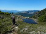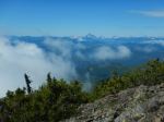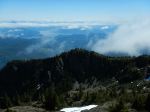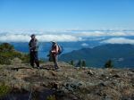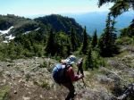 There was some morning cloud, especially in the north, and we parked just above the clouds, which went away as the day warmed up. After the first steep ascent on to the ridge, we hiked along the ridge to the Mt. Kitchener summit, where the communication infrastructure had been removed since our last visit. We had excellent views all around, looking over Johnstone Strait and up Loughborough Inlet to Mt. Waddington. We stopped for lunch before descending and then made the short climb to Mt. McCreight, with more views to the south. We had excellent weather and took our time to enjoy the hike. (4.3 km; 4.25 hours; 475 m elevation gain)