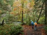 Three of us had a great hike along the west side of the Quinsam River on a beautiful fall day. The trail along the low bank of the river was very busy with the salmon run and many people fishing. We started on the trail from the bridge on Quinsam Road and followed it up stream to the salmon hatchery. From there we hiked up into the forest following mountain bike trails to the high bank area. The maples were at their peak of colour and the forest is quite varied as it meanders up stream. Mostly the trail was in good condition and drier than expected, but unfortunately the motor bike abuse is causing erosion of the trail and bank in places. Occasionally the brush had grown in, but this might deter the motor bikes.