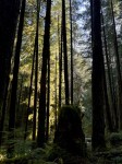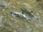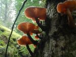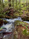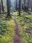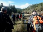Ten hikers started out on the Crikey Creek Trail on a chilly but sunny morning. It was nice to get a day without rain for a change. We came out at the Open Bay Main logging road and proceeded down Open Bay Creek. We followed the trail along the creek and were delighted to see chum salmon still spawning in the creek. It has been a record year for returning salmon. Farther down the trail we ran into three large trees that had blown down and were a bit of a challenge to scramble over. We continued on through the mossy forest and turned up the hill to follow the creek to Beaver Lake. Because of the heavy rainfall the Creek was high with many small waterfalls. We had lunch on the rock bluff at the end of Beaver Lake. The creek was a bit of a challenge to get across, but the group managed and continued up the trail beside the lake. As we continued to climb up to Village Bay Lake Road we were treated to rock bluffs with very heavy deep green moss and many different varieties of mushrooms to look at. From there we proceeded back to the vehicles via the Nugedzi parking lot and logging road. (7.4 km and 3 1/2 hours)