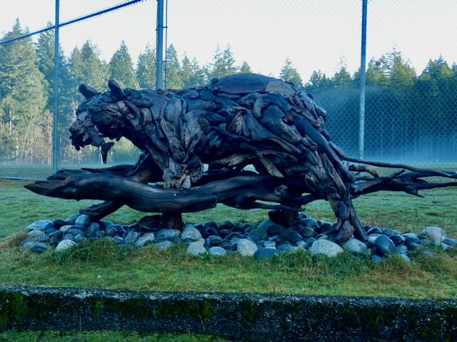 DSCN4376 Published December 19, 2024 at 640 × 480 in Trip Report – Blenkin Park Loop – 9 Dec 2024 Wolf with salmon sculpture