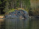 We were on the water at about 10:00 and paddled out, on calm waters, amid a flock of ducks (Buffleheads, Goldeneyes) fleeing our approach. We crossed the mouth of Hyacinthe Bay, and stayed close to the shoreline as we rounded Hyacinthe Point to enter Open Bay. A slight NW breeze rippled the water and we paddled halfway into the Bay before crossing to a group of rocky islands and then along the shore again. The tide was now low enough that we had to go around Valdez Point rather than picking a way through the rocky islets. The rock formations in this area are always fascinating to see close up. At this point two paddlers headed straight over to Breton Island and four of us continued on into Moulds Bay under the watchful eyes of a pair of eagles, one probably sitting on an egg or two, and a rest stop at a gravelly beach below a rustic home. A leg stretch is always welcome after an hour of paddling!