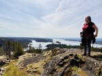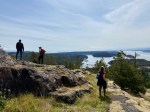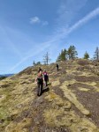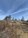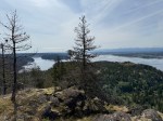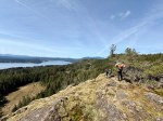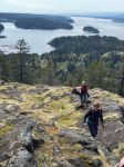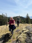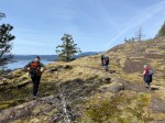 On a gorgeous sunny spring day, five hikers set out from the Copperhead Road parking area to hike around Blindman’s Bluff. There were only a few fallen trees on the trail, so it was in fair shape. There had been no other hikers on the trail since last fall, so it was easy to lose the path because of the new grass growth and trees across it. We had to rely on an old GPS track in a couple of places as we went around the Bluff counterclockwise. We stopped at a couple of open bluff areas to admire the mountains on Vancouver Island. Victoria Peak was especially prominent. As we came across the south side above Gowlland Harbour log sort we decided to go south down the rocky open area and explore a bit. This is a beautiful mossy area and we found many deer bones as well as a full skull where possibly a cougar had feasted. We then returned back to the main trail, continued on around Blindman Bluff Trail, and headed for Eagle Ridge.