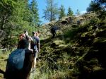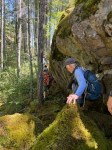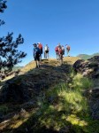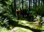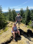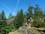 Ten of us had a lovely day for this short hike with great views. We started from Kolker Main and walked up an old logging spur. We were amazed at how the brush had grown up this spring, obscuring fairly well used paths. We quickly arrived at Heron Point for our first viewpoint extending from Hyacinthe Bay to the Chinese Mountains. We continued on into Chauntaluf farm and followed their trails up to the Mt. Sweat access. We climbed steeply up to the first bluff and followed the cairns over the undulating bluffs and up to the Mt. Sweat viewpoint for lunch. The 180° view takes in Quadra and the Salish Sea, with the mainland and Vancouver Island mountains. We descended to the north, following flagging back to Kolker Main and from there to the vehicles. Thanks to Heather Kellerhals for letting the Outdoor Club use the Chauntaluf farm trails to make this loop. 3.7 km, 2½ hours, 180m ascent.