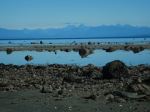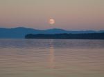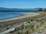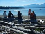 Sunday: Seven of us went straight from the 10:00 ferry from Buckley Bay to the Morning Beach trailhead to take advantage of the relatively low tide, and walk to Tree Island (aka Sandy Island). We descended the stairs on the east side of Longbeak Point and walked north along the shore and then across the sandy flats to Tree Island. It was a perfect, sunny day. We walked across the wooded area for the view north before heading back. We hurried a bit, not wanting to be too late with the turn of the tide, but there was no problem and we could have taken more time. We had lunch once we returned to Longbeak Point on Denman and then continued to the trailhead. (7.5 km, 3h) We went to Fillongley Provincial Park and set up our campsites in this popular park on Lambert Channel. Several people explored Denman a bit more and visited Chickadee Lake looking for the best swimming spot. (2.25 km, 45m). The evening was cool and the group gathered around a fire for happy hour and later for dessert. The moon was nearly full as it rose over the Salish Sea.